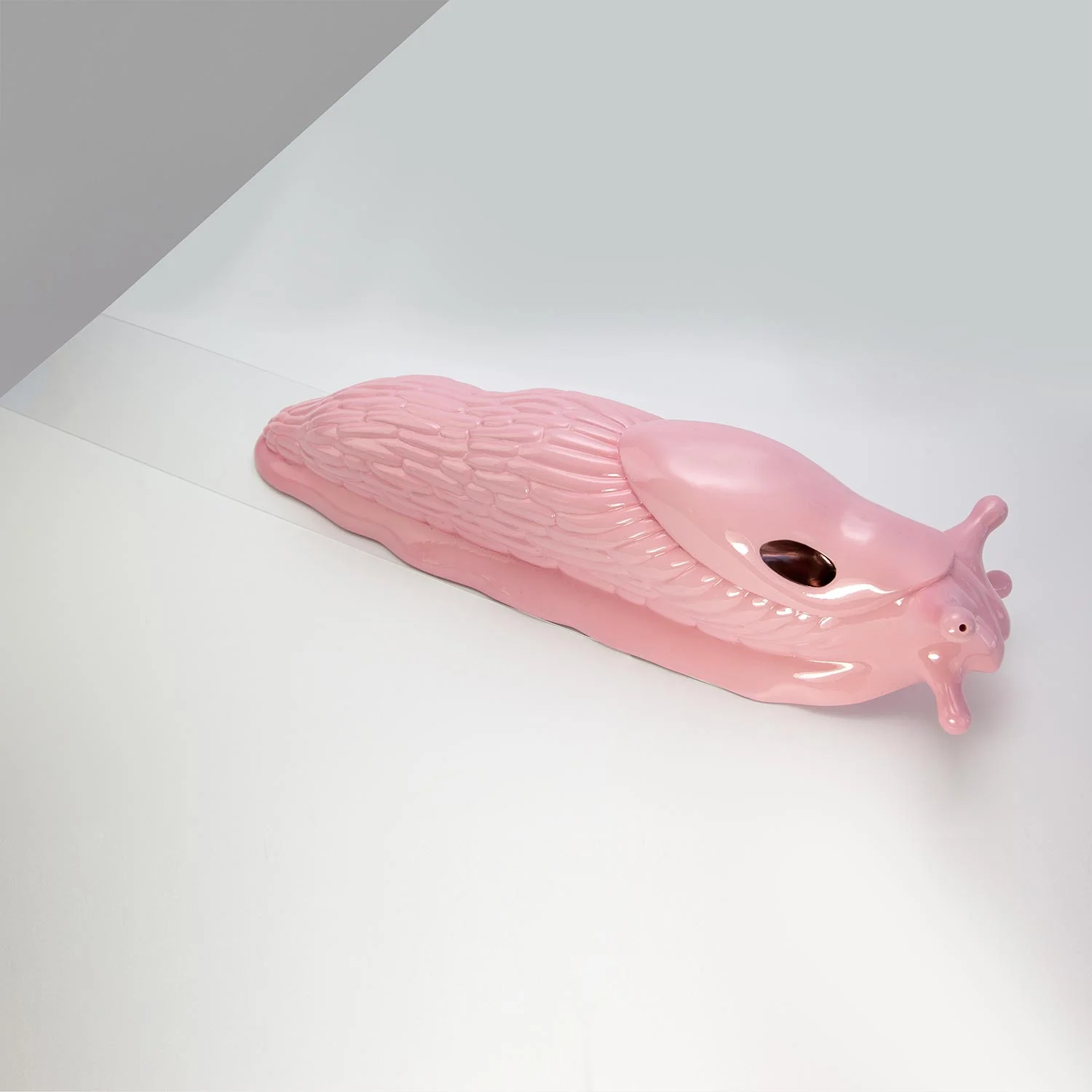 Jesmonite resin cast from an original stone sculpture. Pink acrylic and copper metallic finish. Clear acrylic trail.